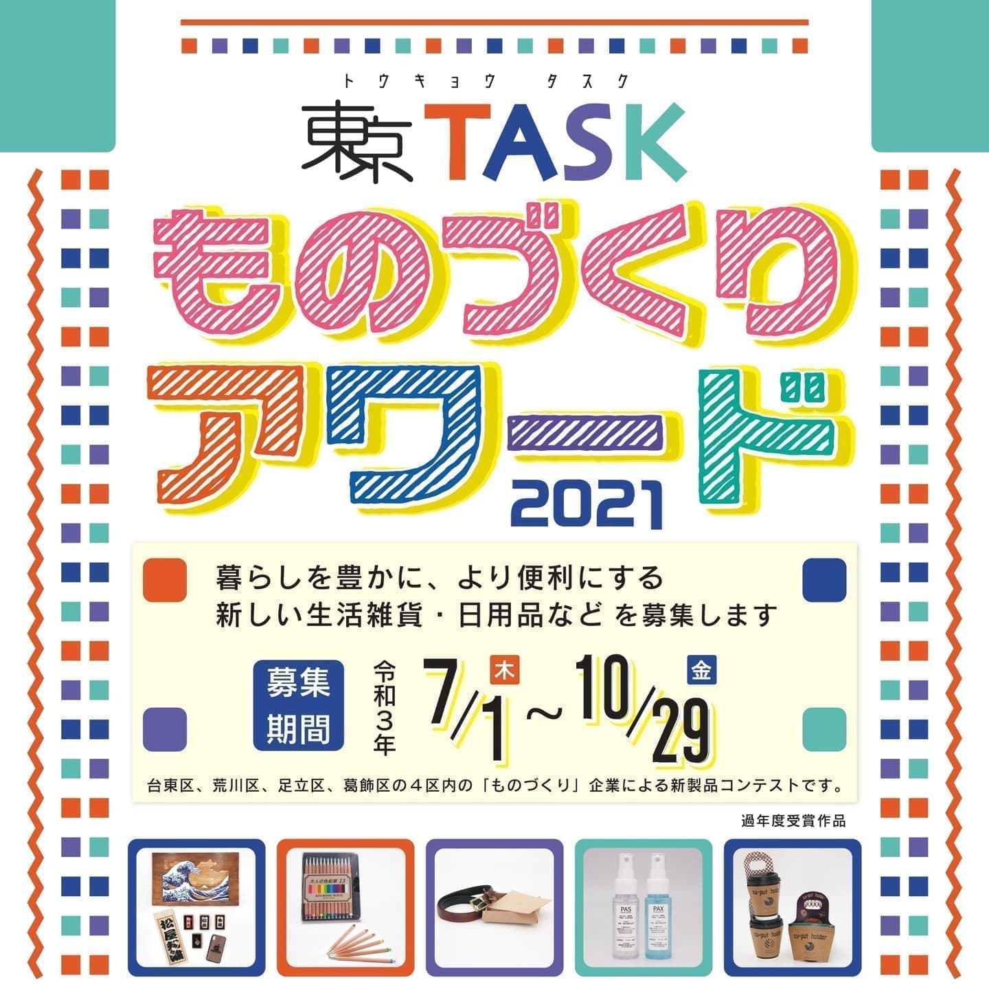 - 東京TASK地域(台東区、荒川区、足立区、葛飾区)内の事業者(企業もしくは個人事業主)で、かつ応募製品の主たる製作者